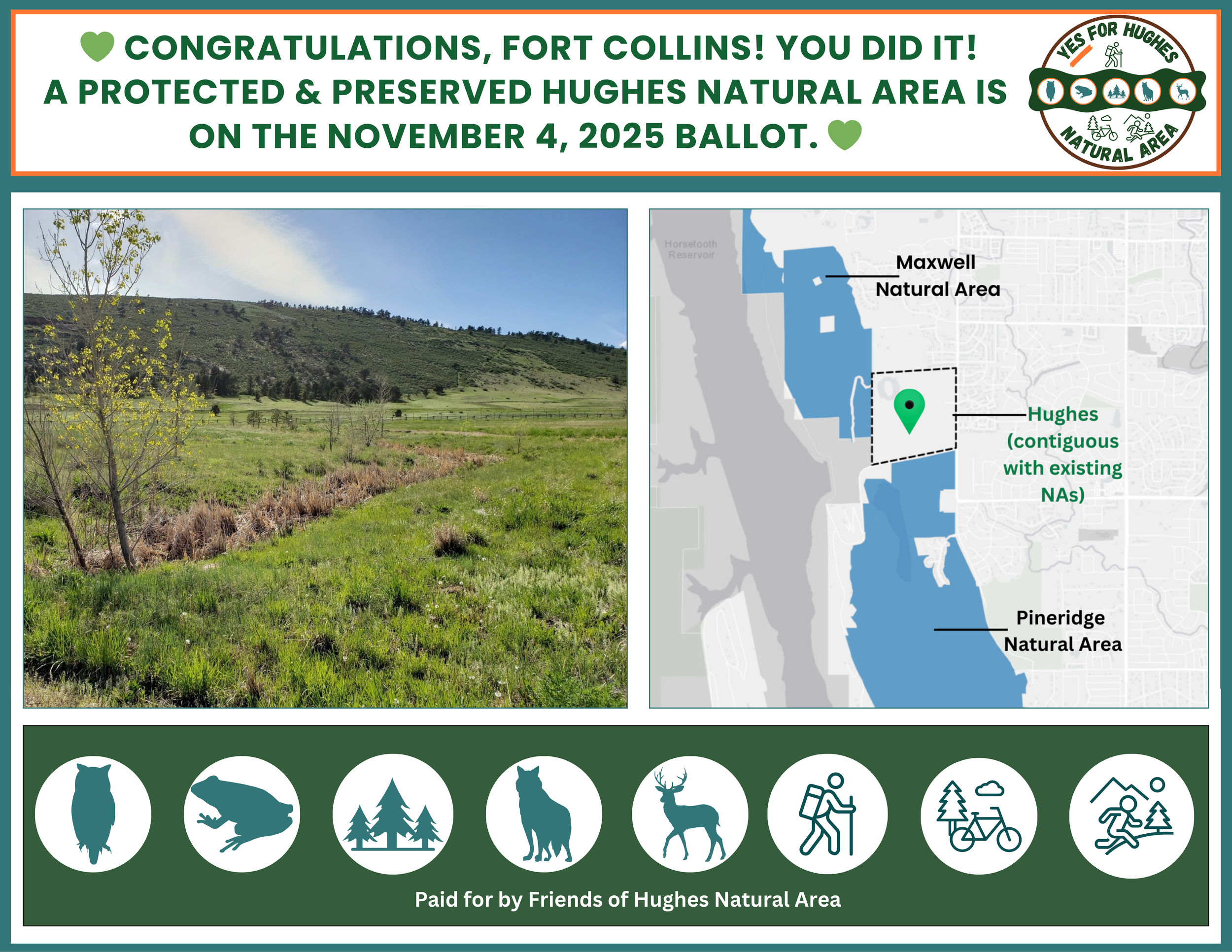 Thank you, Fort Collins! On November 4, 2025, after almost 10 years of relentless hard work and dedication by local residents, Fort Collins voters will finally have their voices heard on whether to designate, once-and-for-all, the publicly-owned Hughes land as an official preserved and protected City of Fort Collins Natural Area, with LOW-impact recreation, for the benefit of ALL members of our community, and for our local wildlife returning to the land.