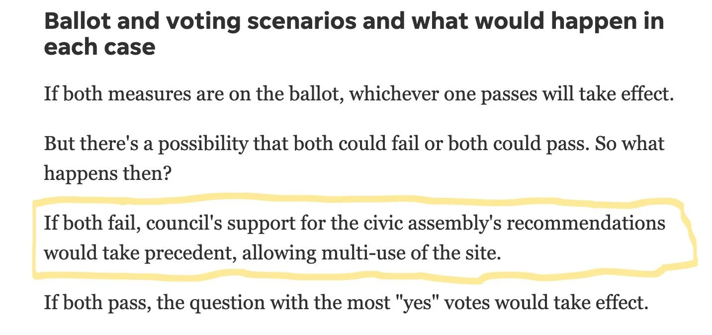 But, and this is important, if both initiatives lose, which unfortunately, is possible, particularly if the pro-Hughes development faction continues to successfully confuse voters, the City’s Hughes development plan still wins, because in yet more political maneuvering, Council also enacted their 2H development concept for Hughes as law (an “Ordinance”) on September 2, 2025.